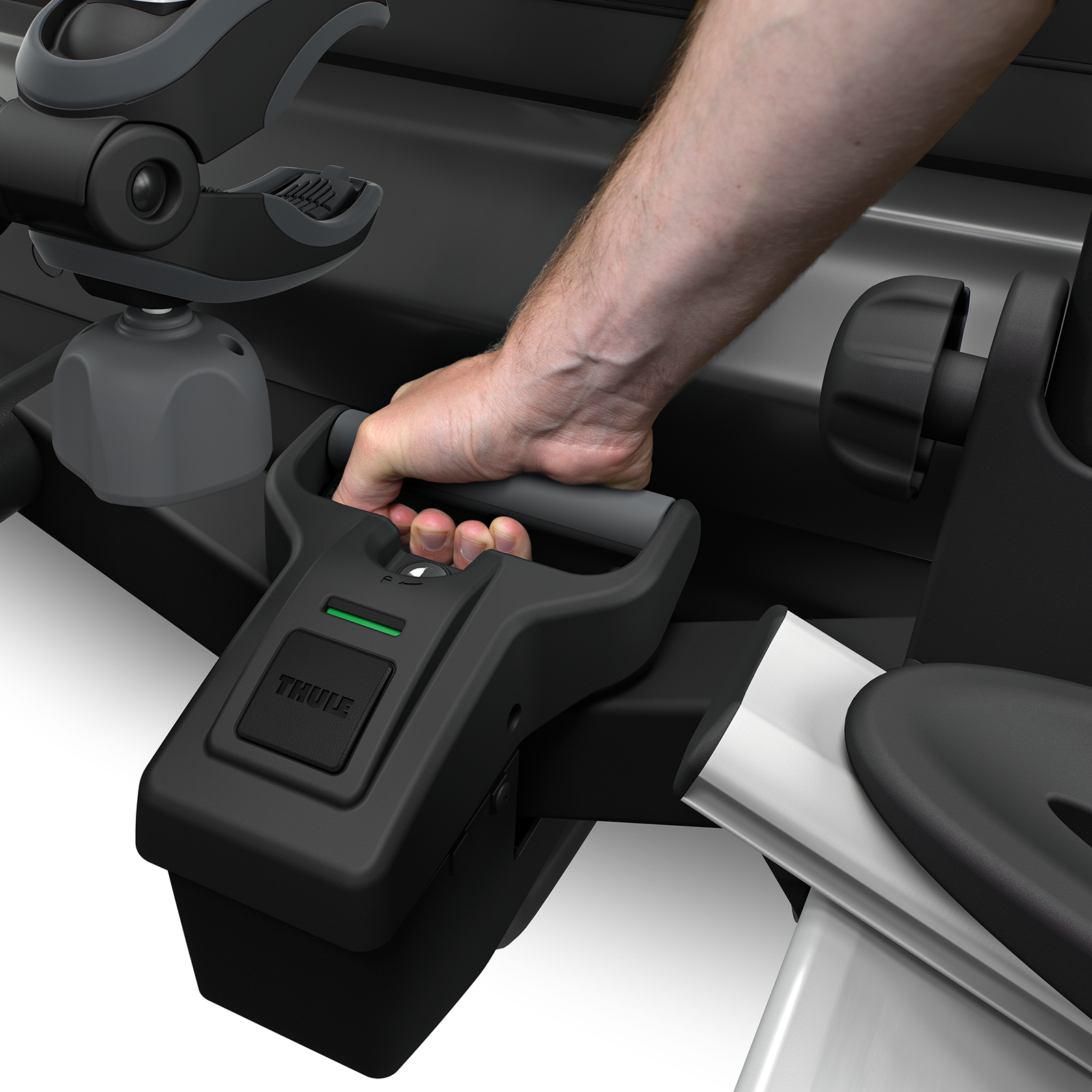 - Einfache Montage und Einstellung des Trägers vor dem Arretieren des Spannhebels dank der stabilen Verbindung zur Anhängekupplung.