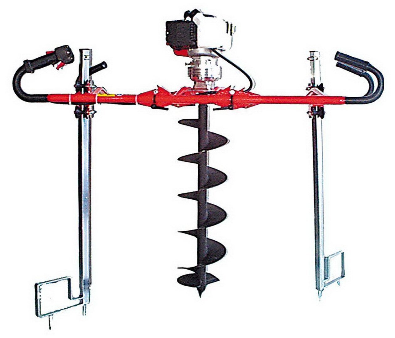 Beschreibung Heiss Bohrfuchs Erdbohrgerät BF Tragbares Zweimann-Erdbohrgerät incl. Erddorne zur Abstützung Made in Germany Erddorne zum Abfangen des Drehmoments – kein Karusselleffekt Einfach zu transportieren dank Einradkonstruktion und Klappmechanischmus Einfacher Bohrerwechsel Technische Daten: 2 Takt-Motor mit 2,8 PS Getriebeübersetzung 104:1 Vor- und Rücklauf Gewicht 22,8 kg Bohrdurchmesser max. 350 mm